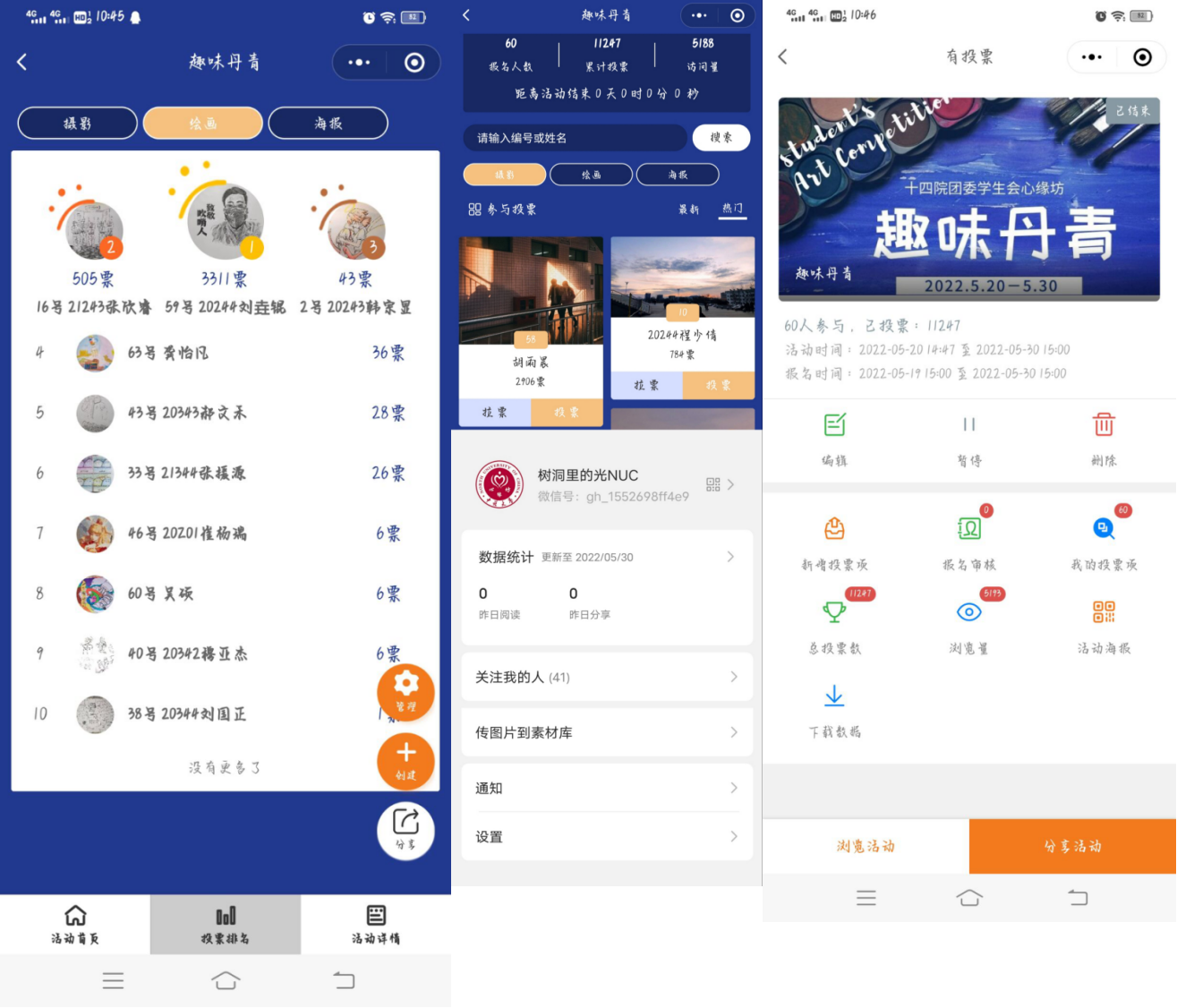 “趣味丹青”活动由摄影、绘画、海报三部分组成。一张张富有色彩的照片描绘着五彩斑斓的世界,展现出丰富有趣的生活。那一次次被定格的瞬间成了永恒,为大家留下了深刻的印象。一幅幅美丽的图画抒发着不一样的情感,散发出心灵的美感。无声的言语,各色的感受,美化人们着的心灵。一张张风格各异的海报展示着不同的个性,体现出了丰富的想象力。“树洞里的光”则通过“树洞倾诉”和“陌生人陪聊”两种形式来帮助缓解同学们的心理压力。活动中,同学们勇于来诉说自己的烦恼和焦虑,同时也通过“陌生人陪聊”这种形式去倾听同学们的喜怒哀乐,让他们的情绪有了去处。为他们解决一些问题,给予一些适当的建议,疫情的封锁对同学们的心理也造成了一些或多或少的影响,无法向朋友或父母诉说的苦闷在“树洞中”得以抒发。