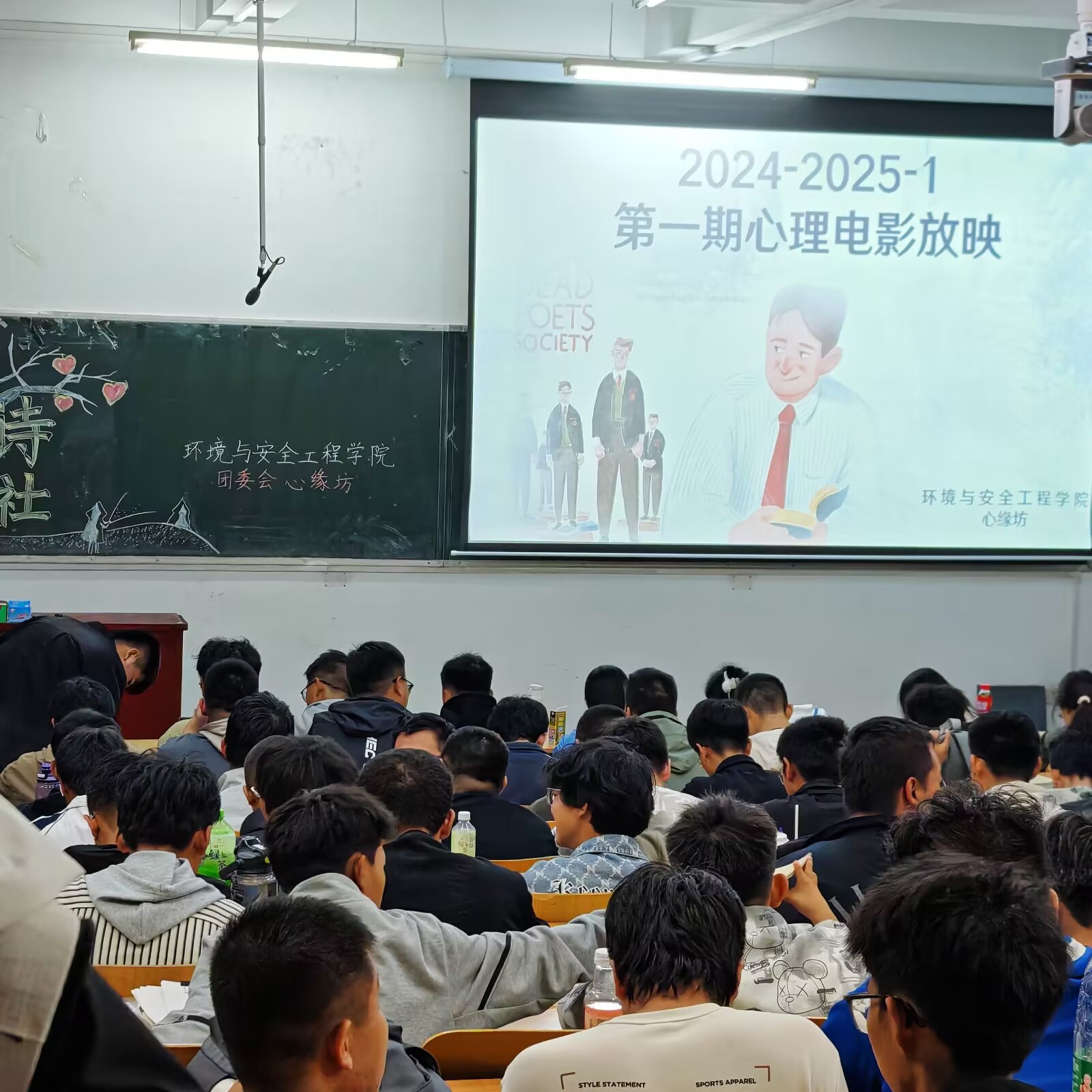 为丰富课余生活,缓解学习压力,让学生快乐成长,2024年10月18日下午17:00点,环境与安全工程学院团委学生会心缘坊在10101教室放映了心理电影《死亡诗社》。
