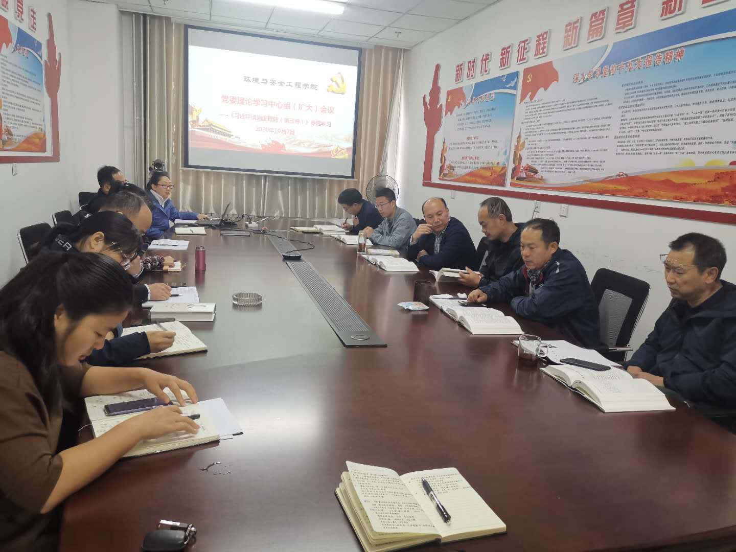 2020年10月7日上午,环境与安全工程学院在科学楼C座614会议室召开党委理论学习中心组(扩大)会议暨意识形态工作分析研判会。学院科级以上干部、各支部书记和系主任参加会议,会议由党委书记赵树森同志主持。