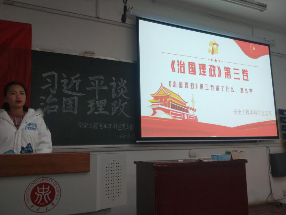 2020年11月29日晚七点,安全工程本科生党支部于10307H开展了以“学《习近平谈治国理政》第三卷,坚定信仰真信笃行”为主题的党日活动,支部全体党员及发展对象参加了此次活动。