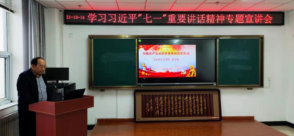 2021年10月14日下午,环境与安全工程学院党委在科学楼C座901会议室举行了学习贯彻习近平总书记“七一”重要讲话精神专题宣讲会,会议特邀中北大学党史学习教育宣讲团成员、马克思主义学院党委书记段义权同志作题为《中国共产党的历史使命和历史担当》的专题讲座。学院全体教工党员和学生支委参加会议,会议由院党委书记赵树森同志主持。