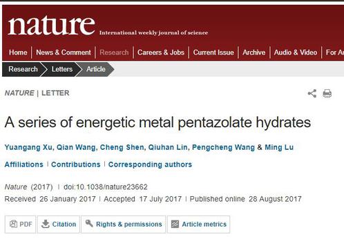 8月28日,我校2015届优秀毕业生许元刚(现为南京理工大学化工学院博士研究生)以共同第一作者身份在国际顶尖学术杂志《自然》(Nature,IF:40.14)主刊发表了高水平论文: A series of energetic metal pentazolate hydrates(系列水合五唑金属盐含能化合物。Nature,2017,DOI:10.1038/nature23662),这是我国首次在(Nature)发表含能研究领域基础科学论文,也标志着我国在含能材料基础研究的一些领域已经处于国际前沿。