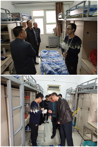 10月31日下午15:00点学院党委书记赵树森,院长王晶禹,党委副书记张少明,综合办公室主任秦胜东,学生科老师代表学院来看望受伤同学高飞,为其送去深切的关怀。院领导详细地询问了发生意外的原因,并且仔细地察看高飞同学的恢复情况,叮嘱其注意康复训练,对同寝室室友对高飞同学的照顾表示感谢和鼓励。面临大四的实习,院领导帮助高飞同学解决困难,鼓励其将健康置于首位,并联系各方协助高飞同学解决医疗保障问题。院领导高度强调了安全的重要性,望同学们能够对危险情况有敏锐的洞察力,能够时刻把安全放在心上,增强自我保护意识。高飞同学面临压力仍保持良好的心态,具有坚韧的太行精神,值得表扬。在院领导和同学的关爱下,高飞同学一定会康复如初,顺利完成学业。