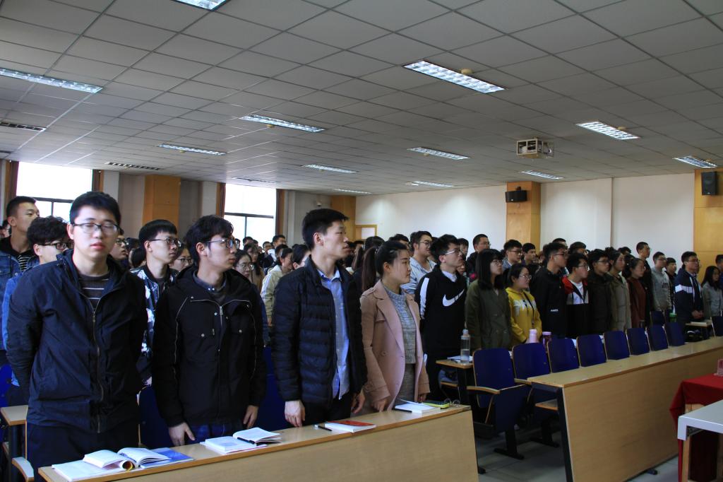 联合党课开班典礼由张少明副书记主持。大会伊始,全体起立,奏唱《中华人民共和国国歌》。奏毕,环境与安全工程学院党委书记赵树森为开班典礼致词。赵书记从入党目的与党员的模范带头作用两方面为同学们进行讲解。他要求同学们要明确奋斗目标、端正入党动机,积极主动参加学院活动,时刻严格要求自己,发挥先锋楷模作用。此外,赵书记举出时事、政事来引领同学们理解习近平新时代中国特色社会主义思想,鼓励同学们紧跟时代潮流,做有为事,成有用人。其后,工作人员宣读入党积极分子联合培训班工作条例,学员代表发言。在庄严的《国际歌》旋律中,环境与安全工程学院和化学工程与技术学院联合党课开班典礼顺利结束,联合党课授课正式开始。