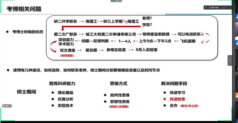 2021年4月12日19:00,第一期朋辈讲堂——“读博那些事儿”正式开讲。讲堂采用线上会议形式,邀请了哈尔滨工业大学的孙淼、北京理工大学的梁家豪、武汉理工大学的衡怡君、西安交通大学的高宏飞以及中北大学的刘淑杰等五位在读博士研究生,为同学们分享了博士申请、课题研究、博士生活等方面的感悟和经验。梁家豪同学重点为大家讲解了博士申请的几种途径及申请过程中的注意事项;孙淼同学和大家共同探讨了博士期间可能遇到的问题及解决思路;衡怡君、高宏飞同学鼓励同学们读博期间不要仅仅局限于论文,要通过参加会议、申请交流、旁听课程等方式提升眼界、开阔思路;刘淑杰同学为大家分享了中北大学硕博连读的条件及在中北大学读博的优势。