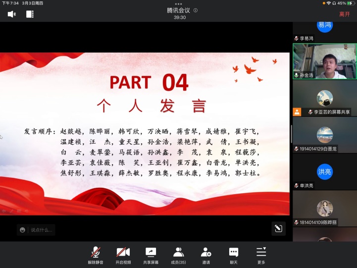 2022年3月3日,环境工程本科生党支部利用“腾讯会议”召开线上组织生活会。
