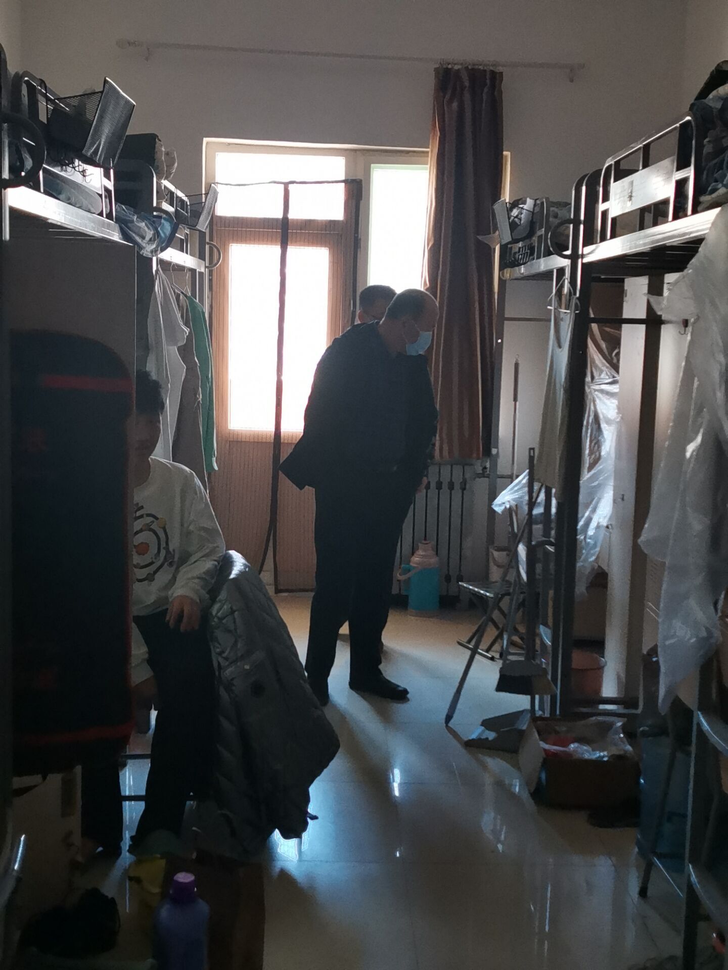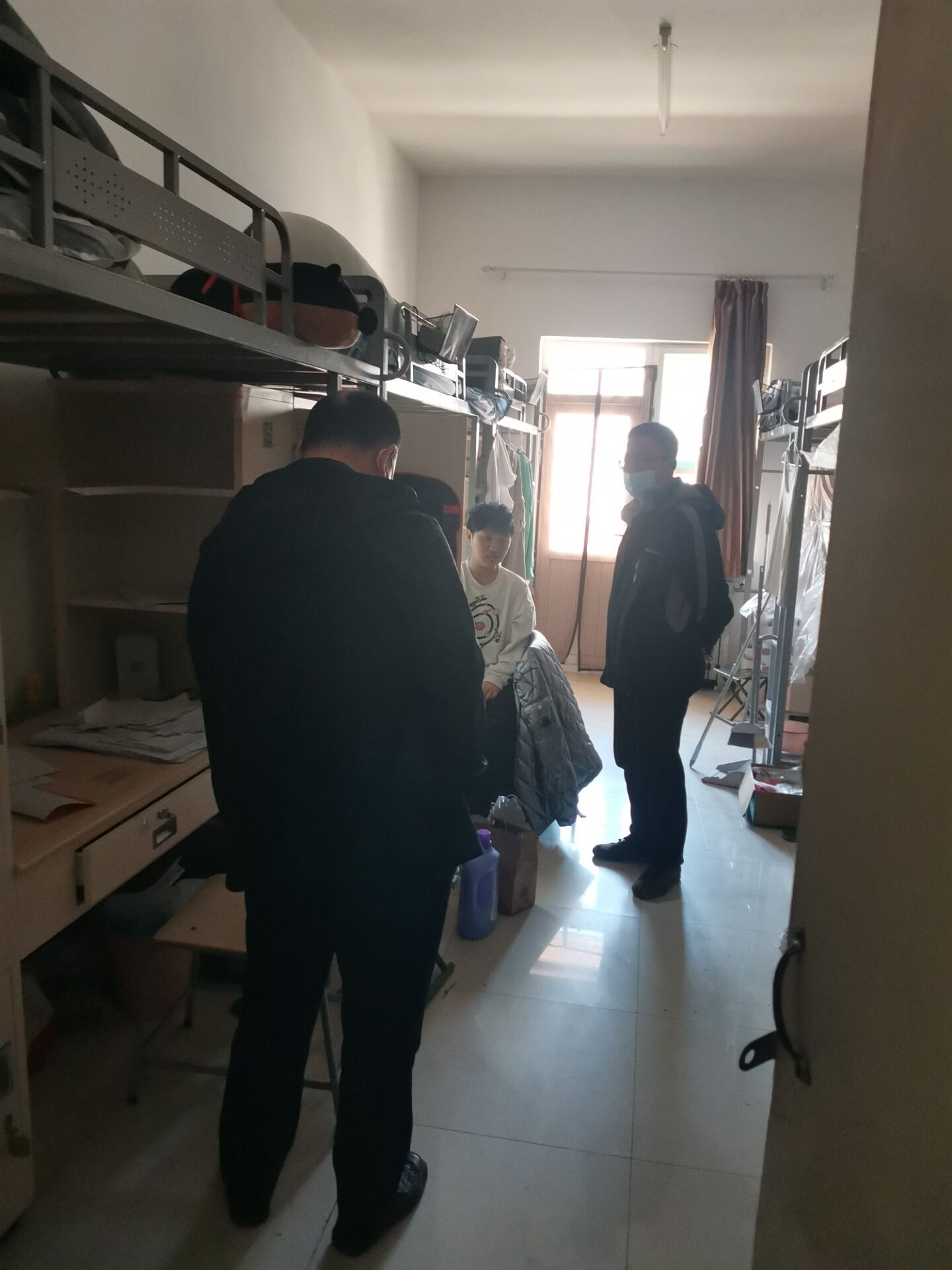 为切实做好疫情防控工作,织密扎牢疫情防控严密防线,加强返校学生的教育管理,2022年4月2日,环境与安全工程学院党委书记赵树森、副书记张少明及全体辅导员深入宿舍检查疫情防控工作。