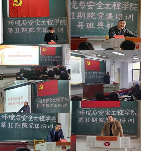 赓续红色血脉,传承奋斗精神,新时代新气象新成员,党组织的新鲜血液再次沸腾。2022年11月5日至11月6日,环境与安全工程学院于11212H举办第十一期院党课培训,学院党委书记王振荣同志、副书记张少明同志、辅导员郭士柱、组织员乔文娟同志出席了开班典礼。