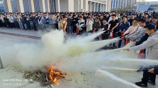 首先,史志强科长向同学们讲解了消防“三懂四会”技能,即:懂本单位或岗位火灾的危险性、懂预防和扑救火灾的基本方法、懂自救逃生的方法;会报火警、会使用灭火器材、会扑救初期火灾、会组织人员疏散。并从学生心态、学生思想、逃生方式等方面对本次演习中出现的问题进行点评与指正。最后,在史科长的带领下,同学们亲自体验了使用灭火器的全过程。