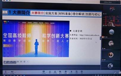 薄瑞峰教授从大赛简介、实施方案、材料准备、理念解读、案例分享、创新与初心六个方面对大赛的整个过程进行了详细解读,重点对材料准备方面进行了深入细致的指导,列举了课程概述、学情分析、教学创新、教学评价、示范推广部分设计的一些范例、技巧。薄瑞峰教授的讲解深入浅出、生动形象,老师们深受启发,促进了对大赛各个环节的理解,明确了发力的方向。
