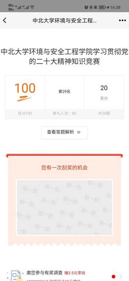为深入学习贯彻落实党的二十大精神,引导学院师生认真学习领会党的二十大精神实质,营造“比学赶超”的浓厚学习氛围,12月6日~8日,环境与安全工程学院组织开展了“学习贯彻党的二十大精神”网络知识竞赛活动。本次活动面向全院师生党员,比赛主要通过线上答题方式举行。